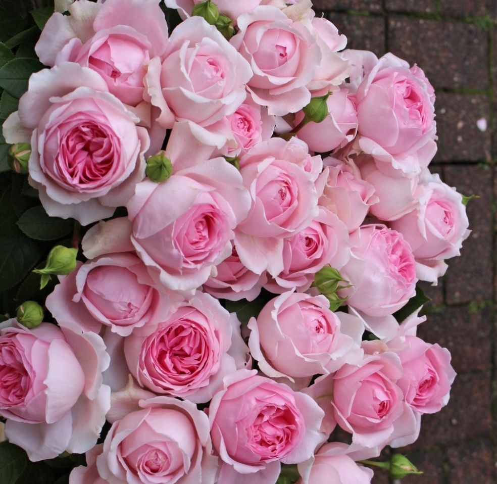 Цветки диаметром 8-10 см, махровые, старинной формы, розовые, очень устойчивые к атмосферным воздействиям.