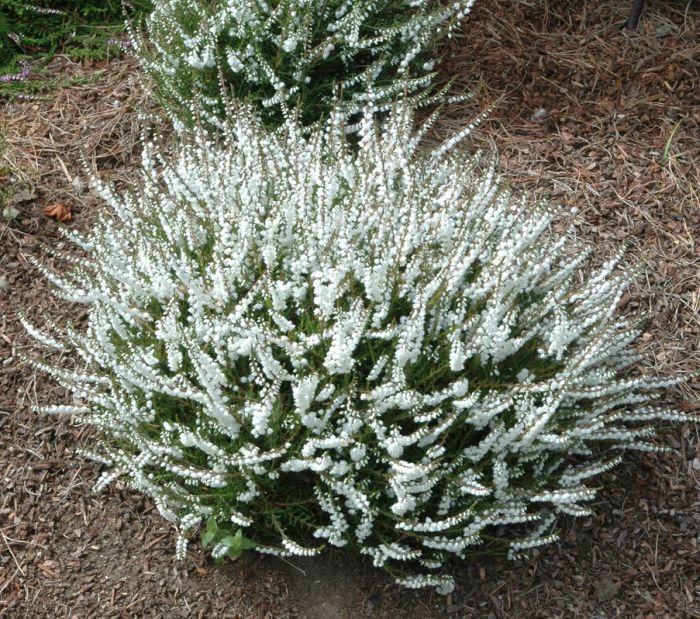 Вереск обыкновенный Long White (Лонг Вайт) - это вечнозелёный небольшой кустарник. Крона рыхлая, вертикальная, шаровидная. Кора тёмно-бурая. Сорт выведен в Голландии в 1962 году. Растет медленно. Листья длиной до 30 см. узкие, ярко-зеленые. Основные корни глубокие и широко распростертые, с большим количеством тонких корней. Цветки белые, простые, собраны в длинные соцветия - 25-30 см.