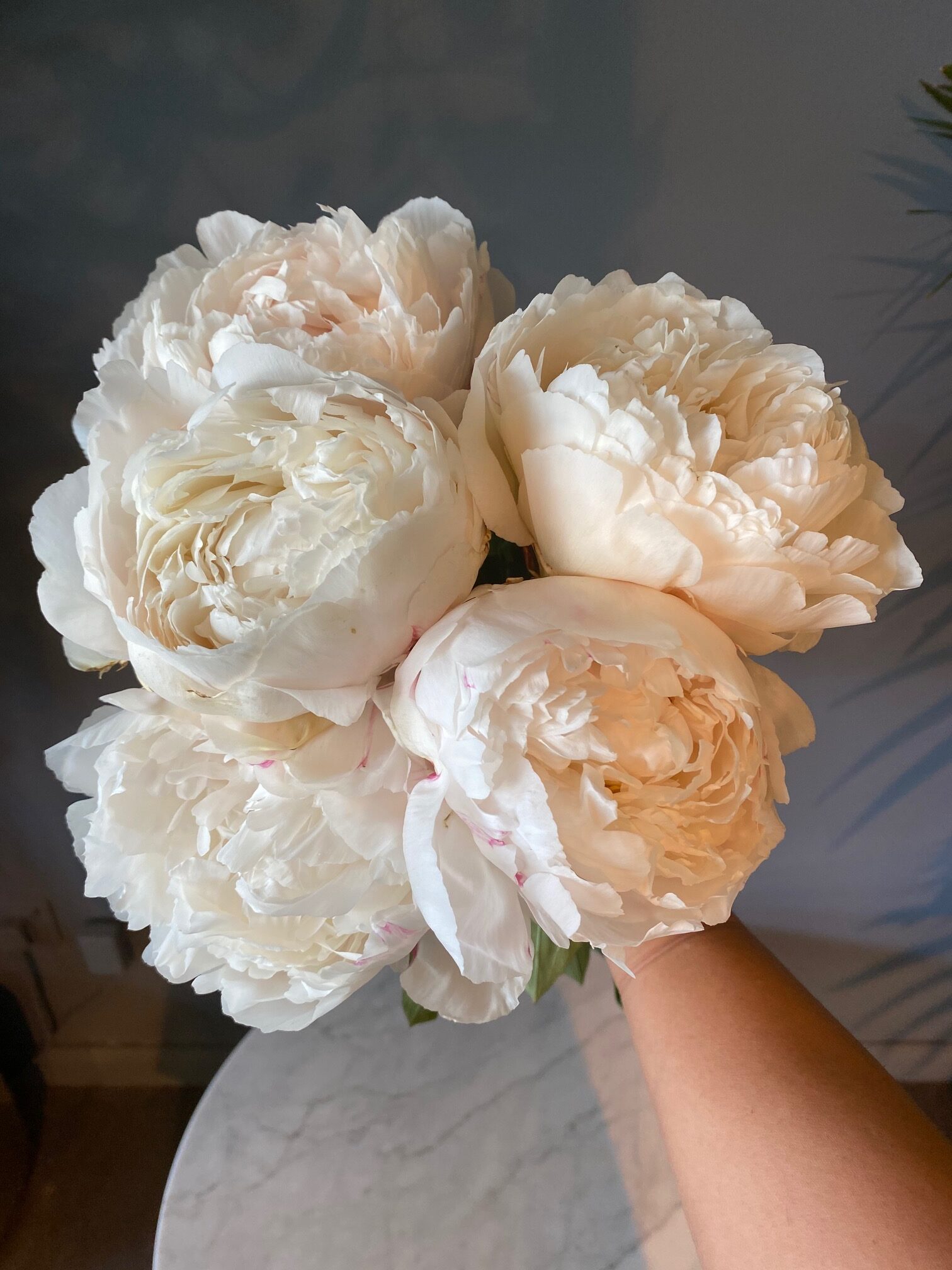 Цветок диаметром 19 см, плотно набитый, бело-кремовый, нежно-переливчатый, с подсветом от колец тычинок.