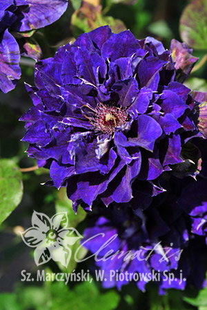 Цветки темно-фиолетовые, махровые диаметром 10-12 см, с многочисленными изогнутыми чашелистиками с серебристой, красиво контрастирующей нижней стороной. Тычинки с фиолетовыми пыльниками на белесых нитях.