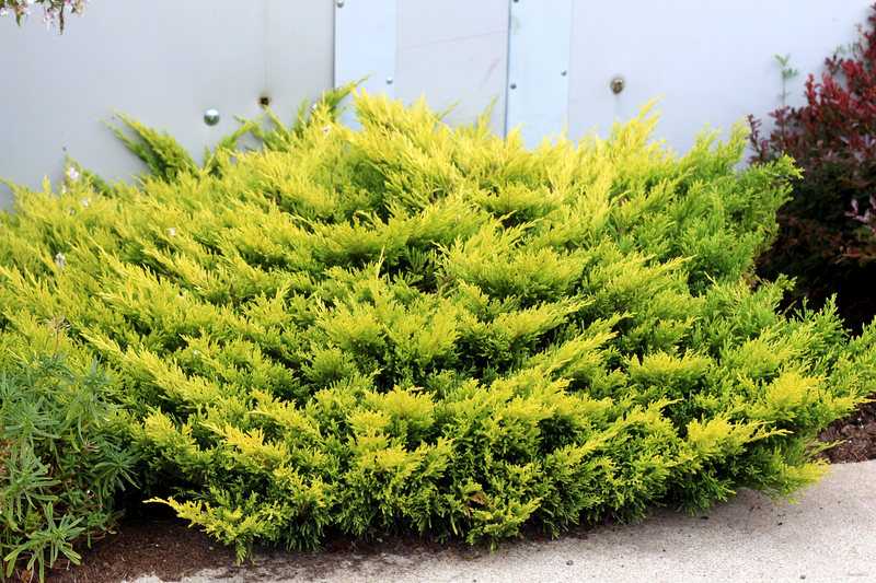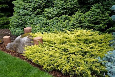 Симметричная округлая, воронковидная крона лимонного цвета. Высота взрослого растения – 0,4 м, диаметр – 1,5 м. Растёт медленно.