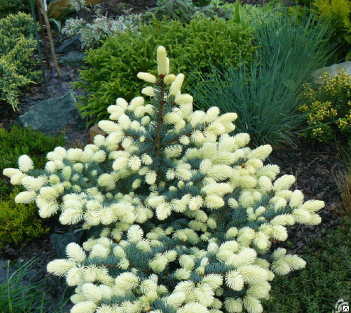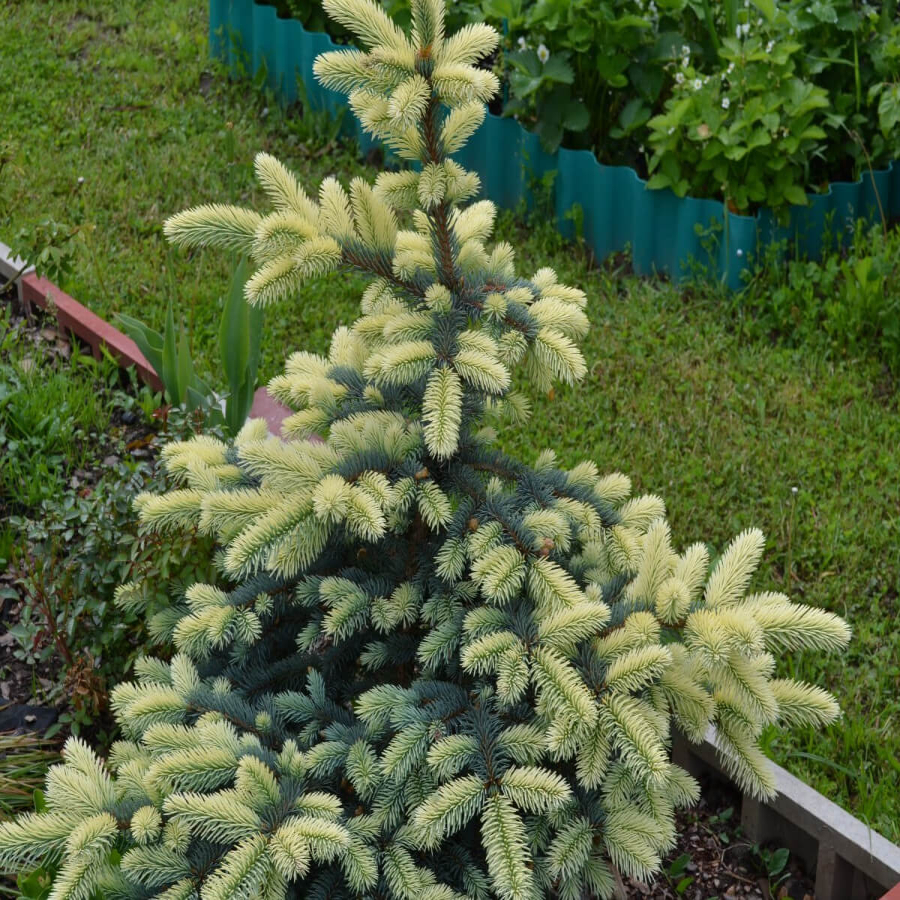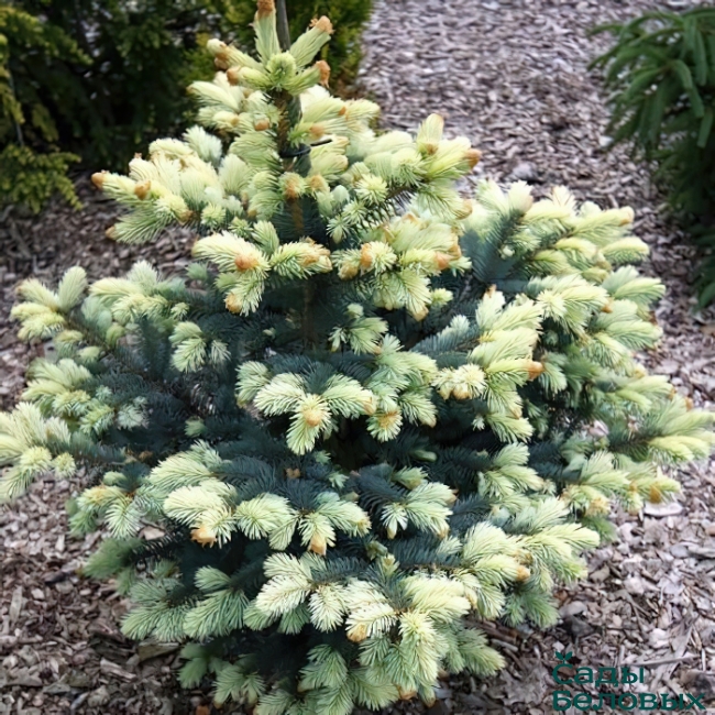 Польский сорт ели с характерной окраской молодых побегов. В молодом возрасте полушаровидной формы, без проводника. Через несколько лет появляется проводник и принимает форму широкого конуса. Он растет медленно. В возрасте 10 лет достигает примерно 2 м в высоту. Через много лет вырастает до 3-5 м в высоту и 3 м в диаметре. Стебли короткие, жесткие, расположены горизонтально. Хвоя толстая, до 3 см длиной, жесткая, очень колючая, расположена на побегах радиально, с обеих сторон серебристо-голубая. Молодые приросты интенсивно кремово-желтые. Цвет прироста держит 1,5 месяца, после приобретая синеватую окраску. Шишки не завязывает. Полностью морозостойкий.