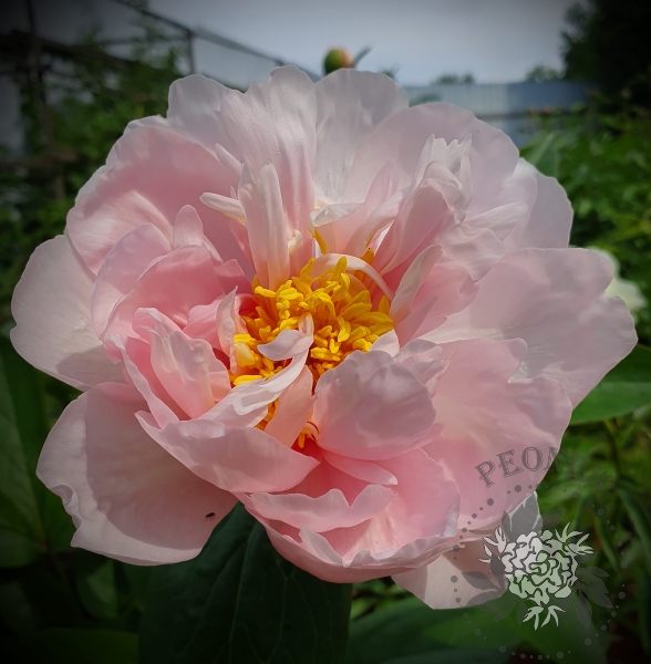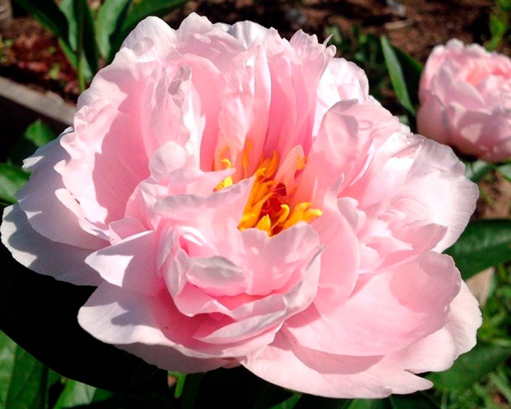 Цветок полумахровый, розовый. Образует большой розовый шар, длинные широкие защитные лепестки окружают несколько рядов внутренних лепестков которые обрамляют тонкую полоску природных тычинок.