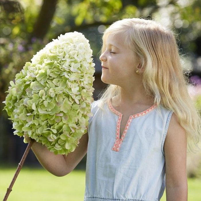 Куст высотой и шириной 100-150 см. Побеги прочные, толстые, прямые. Листья тёмно-зелёные, с обеих сторон грубо опушённые. Цветки исключительно стерильные, крупные, зеленоватые, в полном расцвете белоснежные с зеленоватыми кончиками, в конце лета розовеющие. Соцветия конусовидные, плотные, очень крупные. Цветение с июля до сентября