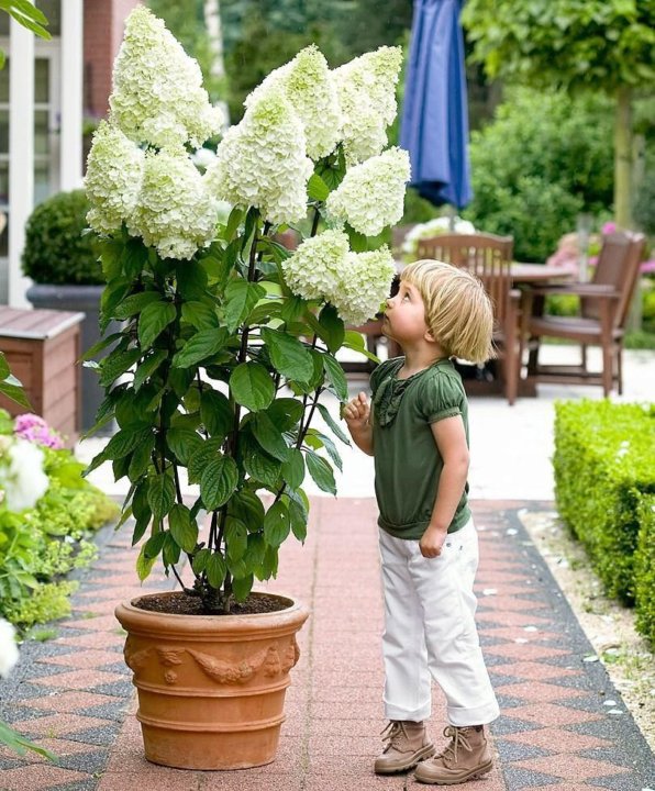Гортензия метельчатая Полярный медведь на штамбе - морозостойкий сорт гортензии метельчатой. Гибрид между сортами Limelight и Grandiflora. Раскидистый крупный кустарник до 2 м высотой, и диаметром кроны до 1,5 м. Гортензия на штамбе очень декоративна и может стать украшением любого участка, как при одиночной так и при групповой посадке. Эта гортензия цветет очень крупными плотными коническими соцветиями около 40см длиной, состоящими из белых, в начале цветения - зеленоватых, цветков, которые к осени приобретают легкий оттенок розового. Цветет обильно с июля по октябрь на побегах текущего года.