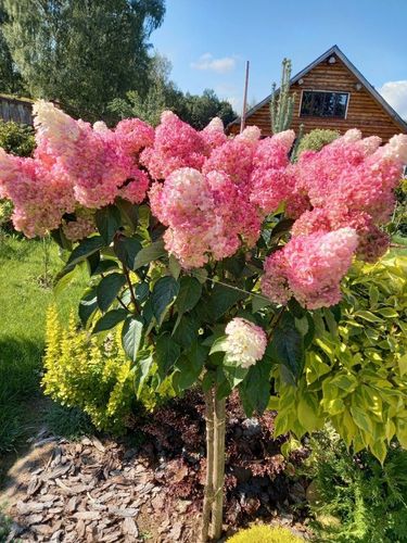 Гортензия метельчатая Ванилла Фрейз на штамбе - один из красивейших сортов гортензии, имеющий огромную популярность в Европе. Он отмечен международными наградами за декоративное переходное сочетание оттенков от белого до глубоко розового, которое можно наблюдать на кусте одновременно. Кустарник с редко разветвленными, прямыми жёсткими побегами, которые сгибаясь под тяжестью цветков придают ему шарообразную форму Высота до 1,5 – 2 м. Данный сорт характеризуется уникальной необыкновенной окраской цветов, которая может быть на одном кусте как белой, так и ярко-красной одновременно. Примечательно, что в начале цветения гортензия усыпана белыми цветами. Затем розовеют и становятся похожи на «клубничное мороженое», окраска может меняться в зависимости от типа почвы и климата. Цветки в длинных широкопирамидальных метелках до 25 см длиной. Цветет продолжительно — с июня до октября