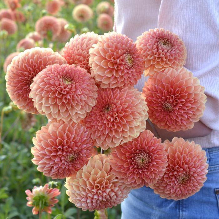 Цвет — персиково-абрикосовый с розовым штрихом по кромке и чуть более тёмным кольцом у центра, благодаря чему кажется, будто шар подсвечен изнутри. Лепестки свёрнуты внутрь ровной спиралью Ball-типа, диаметр обычно 10–12 см — форма чистая, без провалов в центре и с аккуратной округлой линией для букета.