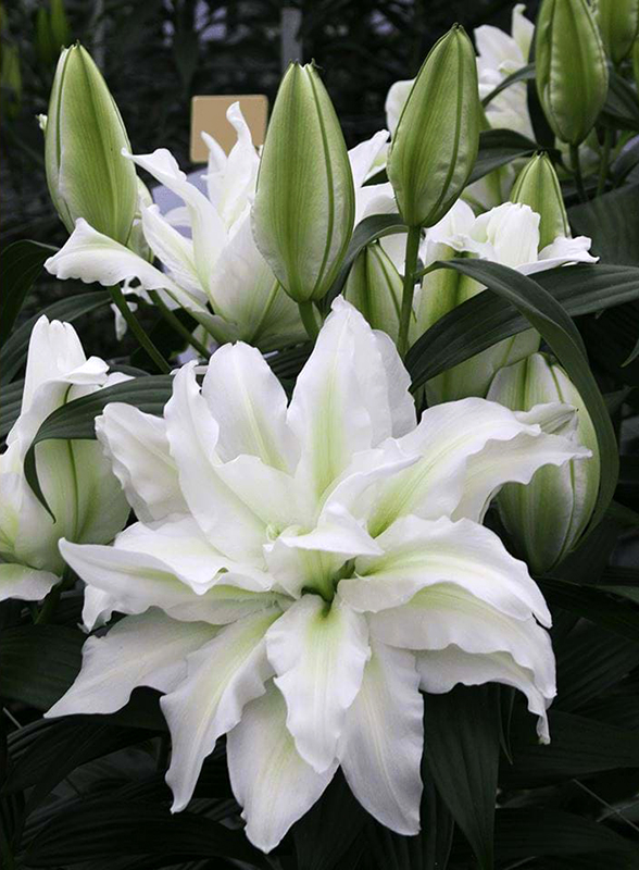 Лилия Роузлили Аиша белая восточная розовидная - высота стебля около 80см, цветение к концу июля, но цветет немного дольше других лилий. Цветы этой лилии размером до 20 см, густо-махровые. По краю тонкие волнистые лепестки белые, а середина цветка нежного салатного оттенка с зеленой полосой. Хорошо смотрится в групповых посадках на клумбах и в декоративных контейнерах.