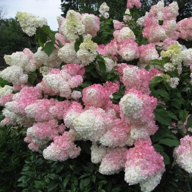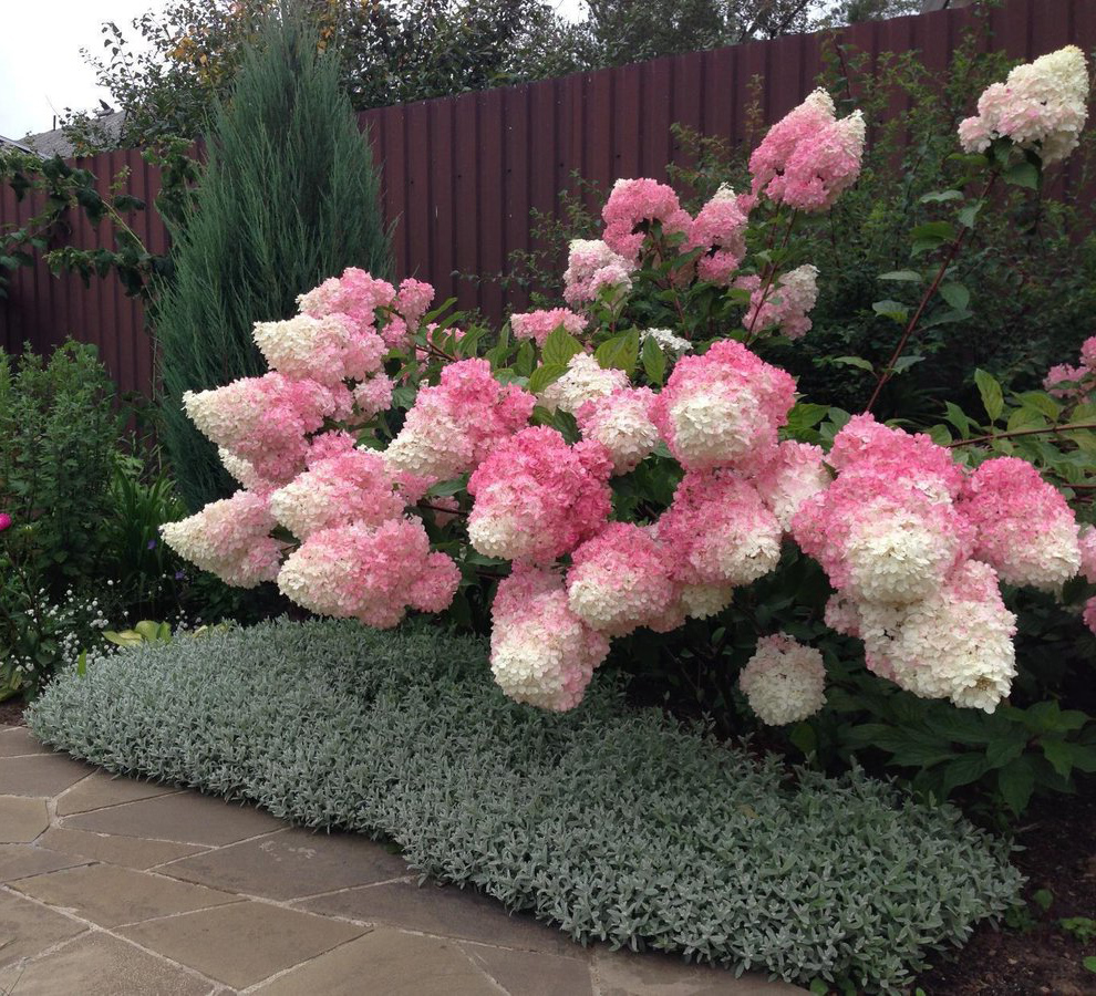 Огромные, плотные соцветия широкопирамидальной формы, с нижними боковыми выступами. На хорошем агрофоне высота конуса иногда достигает 40-50 см. Цветы расположены по всему объему куста очень густым каскадом, сначала молочно-белые, затем нежнейшего розового оттенка, к концу цветения становятся насыщенно красными, почти вишневыми.