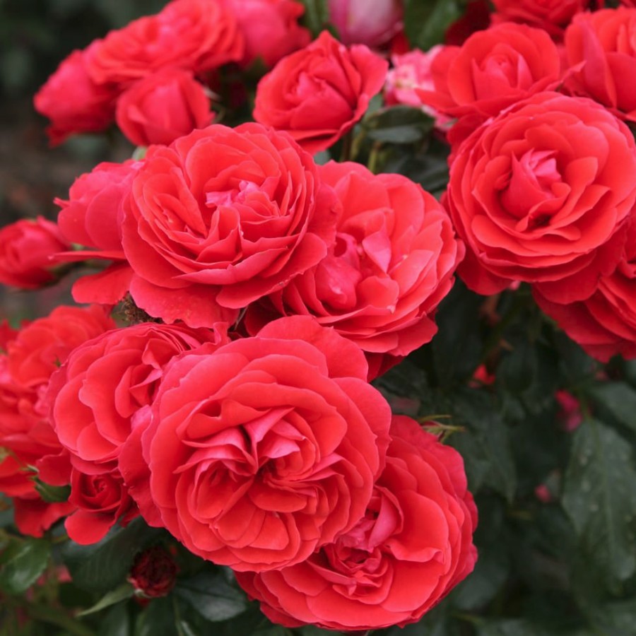 Вишнево-красные, густомахровые (до 60-70 лепестков), чашевидные цветки старинной формы появляются в небольших кистях из темно-красных, округлых бутонов.