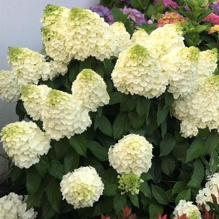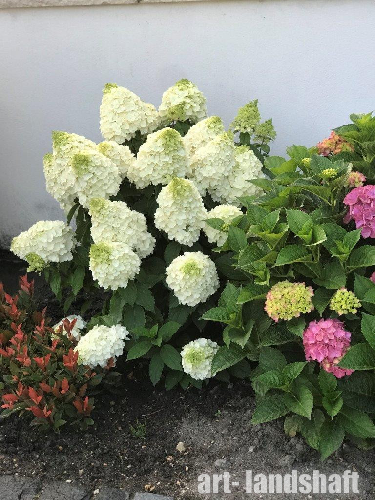 Цветки крупные, стерильные, чисто-белые в нижней части соцветия, зеленые – в верхней. Соцветия широкопирамидальные, остроконечные, плотные.