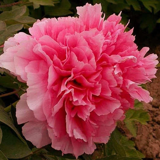 Цветок махровый корончатый, 14х8 см (до 20 см), аккуратной формы, от кораллово-красного до лососёво-розового, смотрит вверх. Кончики лепестков розовато-белые. У основания лепестков тёмно-фиолетовые пятна.