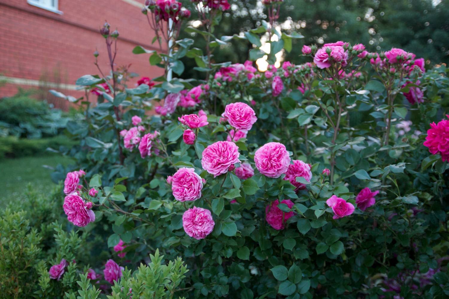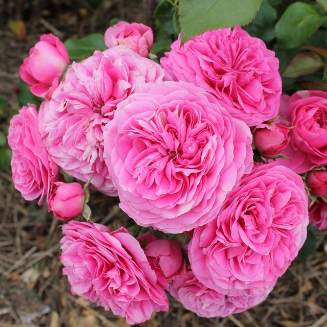 Цветки диаметром 6-8 см, махровые, розеточной формы, в интенсивном пурпурно-розовом цвете.