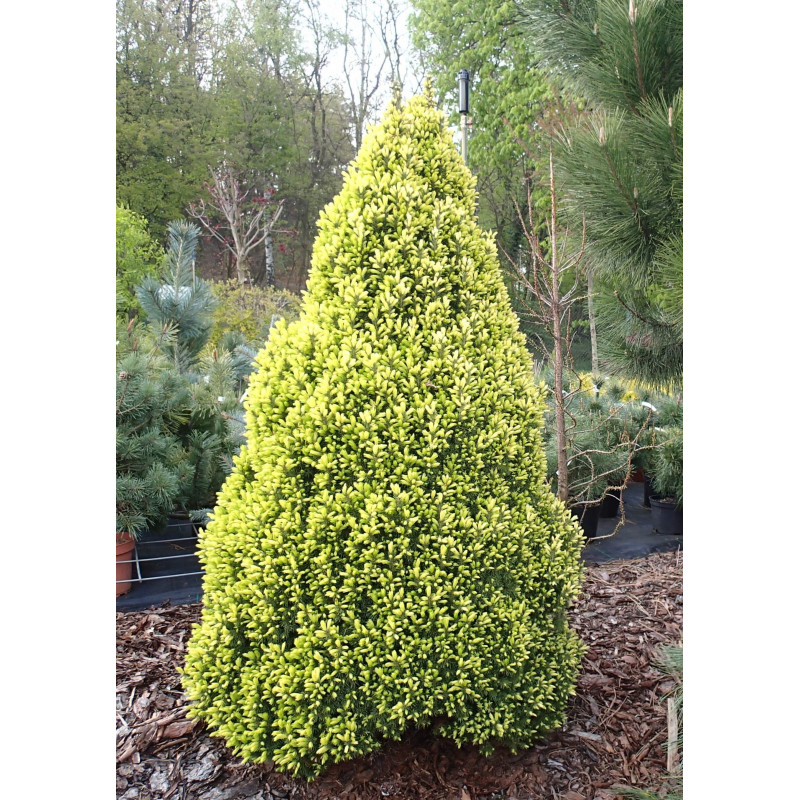 Коническая компактная плотная форма, к 10-ти годам высота 60 см, молодые побеги весной светло-кремовые, затем зеленеют, место солнечное, почва влажная, хорошо дренированная, плодородная, для альпинария и выращивания в контейнерах.